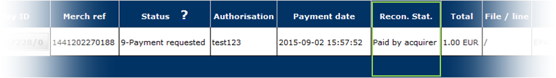 The Recon. Stat. (Reconciliation status) field, visible in the transaction details screen via View transactions, gives information about the financial processing of the transaction.