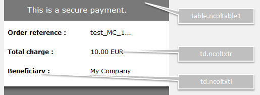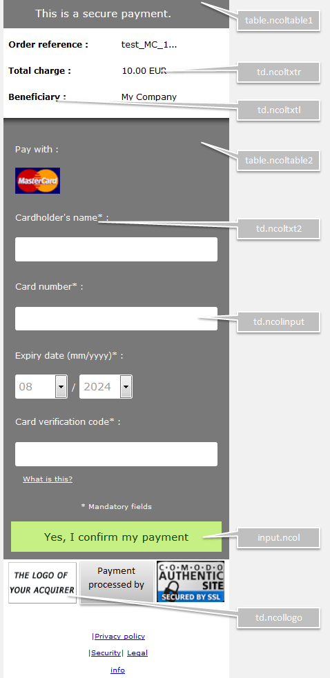 - Payment detail information (e.g. order reference, fields where the customer enters his card details, etc.)